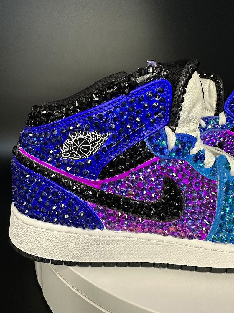 Mejora tu estilo deportivo con unas Jordan 1 mids llenas de brillo. Tengo otras versiones de esta lista, pero estas tienen un estampado degradado BEAUTIFIL. ¡Son ideales para una fiesta de graduación, un cumpleaños, una boda, una salida nocturna o tu próximo evento! Puedes personalizarlas con los colores que prefieras.